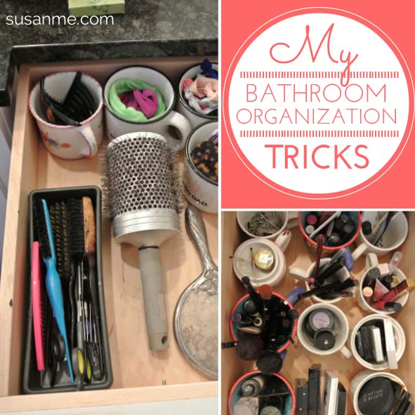 Then it hit me–the coffee cups! A lovely solution. Freed up a whole shelf in the kitchen. And they keep my make up and hair accessories accessible and organized. Lastly, I just throw them all in the dishwasher when they need to be cleaned.